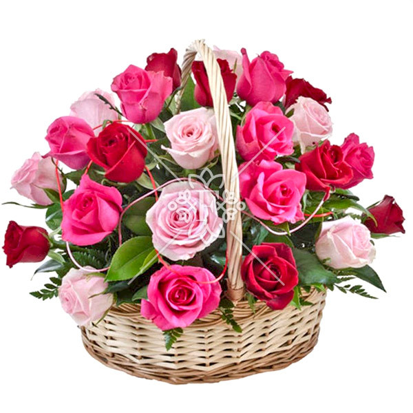 роза красная – 5 шт., роза розовая – 5 шт., роза малиновая – 5 шт., декоративная зелень, оазис, корзина.